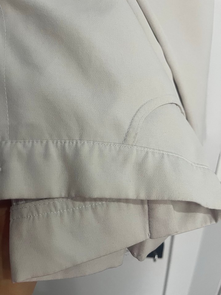 Bej renkli, düz kesim, düğmeli kadın kumaş pantolon. Midi boyda ve minimalist tarzda, ofis için uygundur.