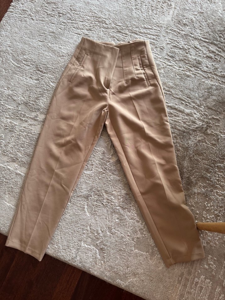 Düğmeli ve düz tasarımlı, orta boy bej kadın kumaş pantolon. Rahat kesimi ve sentetik dokusuyla günlük kullanıma uygundur.