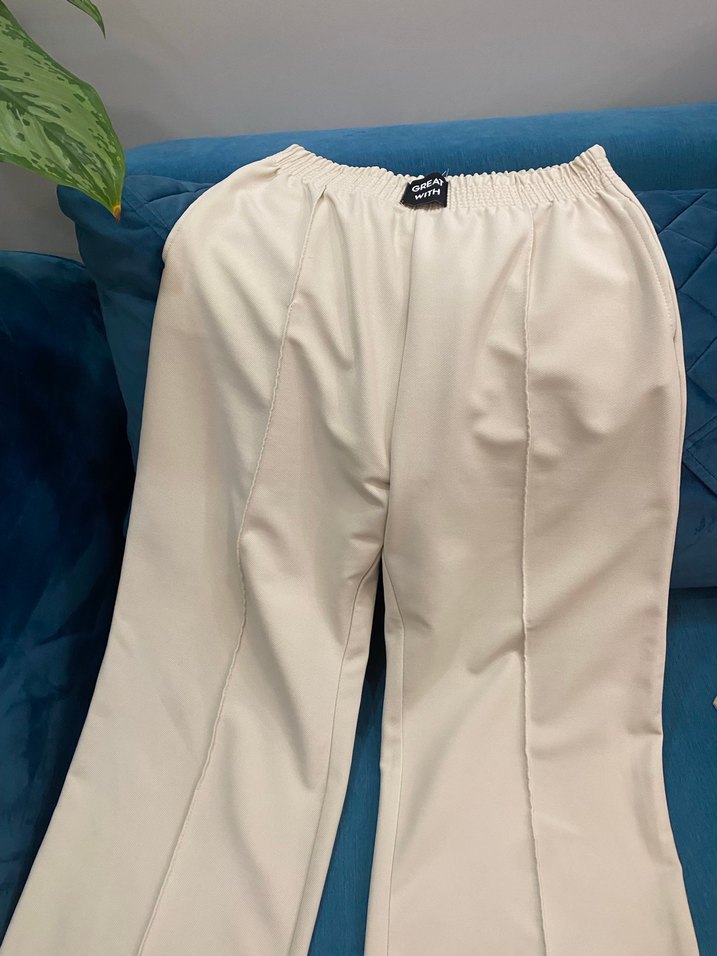 Düğmeli, midi boy, bej renkli kadın kumaş pantolon. Sentetik, yumuşak dokulu kumaştan, rahat ve minimalist tarz için uygundur.