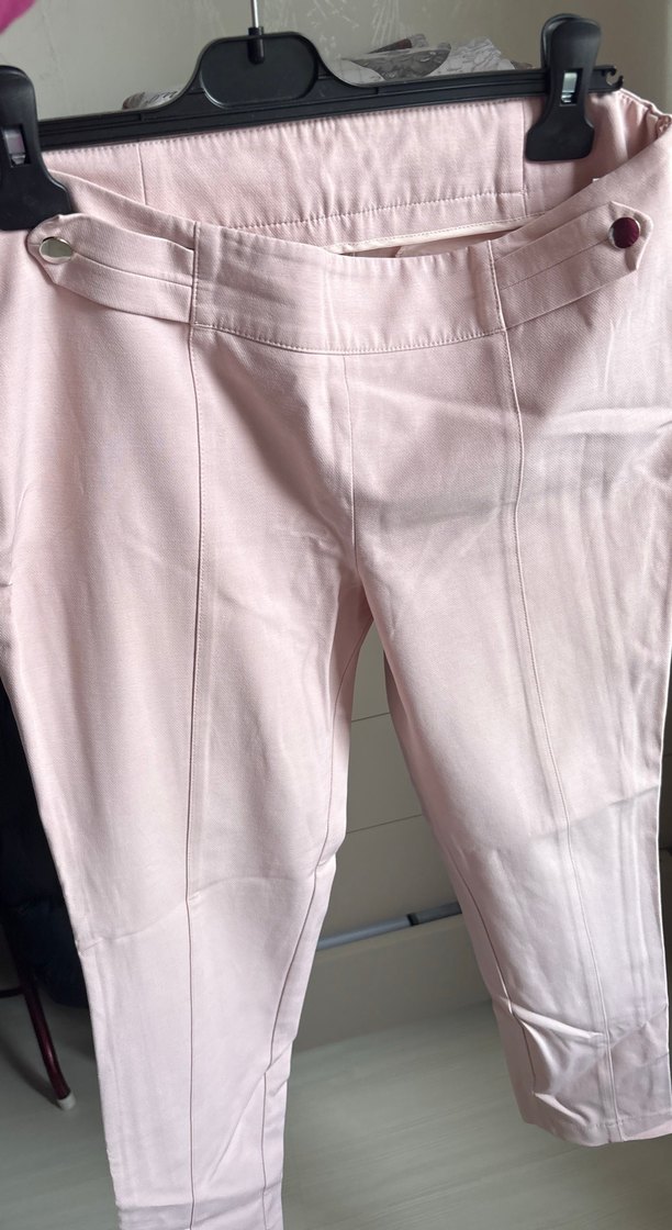 Pudra renkli, düğmeli, bacak arasından 65cm boy kadın kumaş pantolon. Rahat kesim ve yumuşak sentetik kumaştan üretilmiştir. Minimalist tasarıma sahiptir, günlük kullanım için uygundur. Yandan farmuarlı