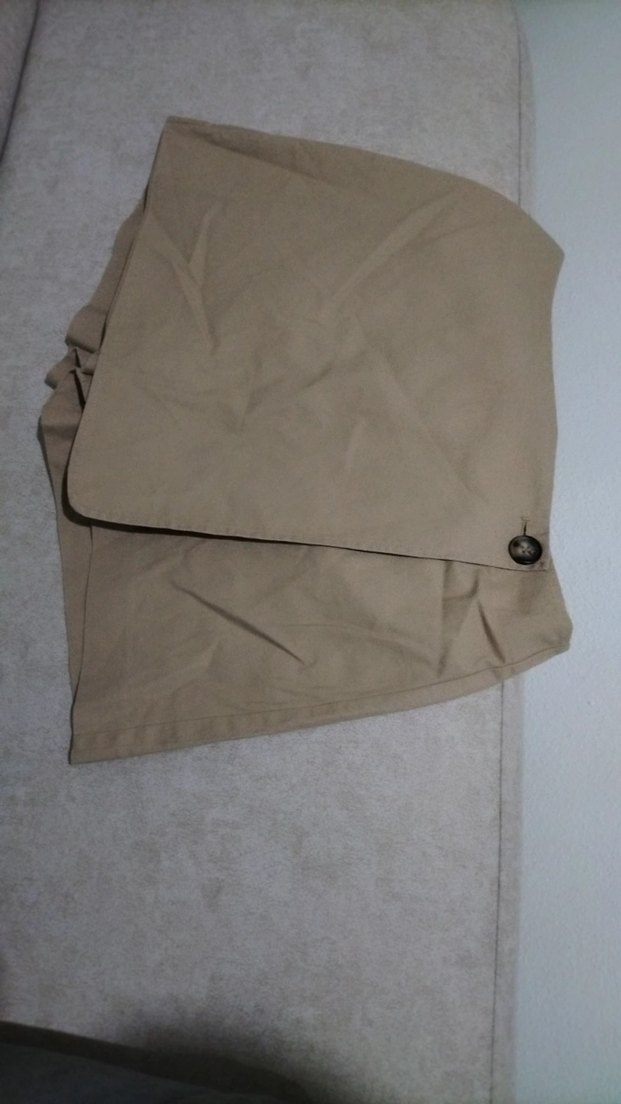 Sentetik kumaştan, düğmeli, midi boy, bol kesim bej kadın kumaş pantolon. Dış mekan kullanımı için uygundur.