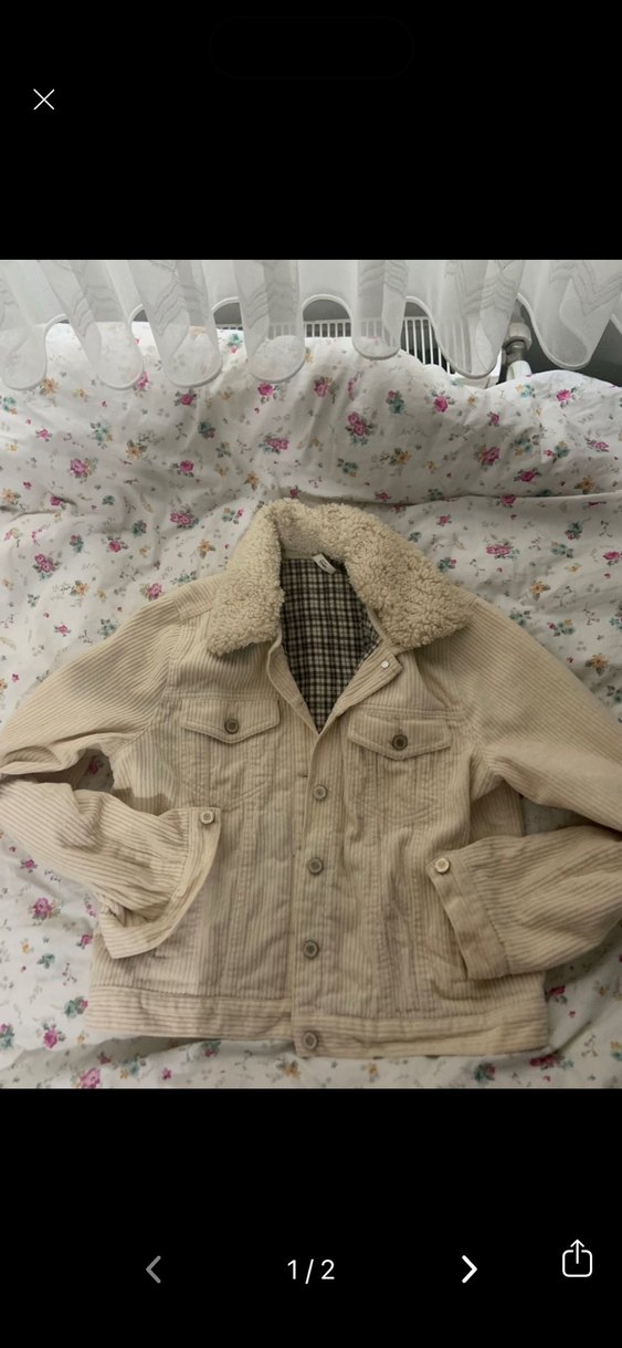Bej pamuk ceket, düğmeli ön kapama ve yumuşak astarlı, kesik yakalı. Uzun kollu, bol kesim, rahat sokak stiline uygun.