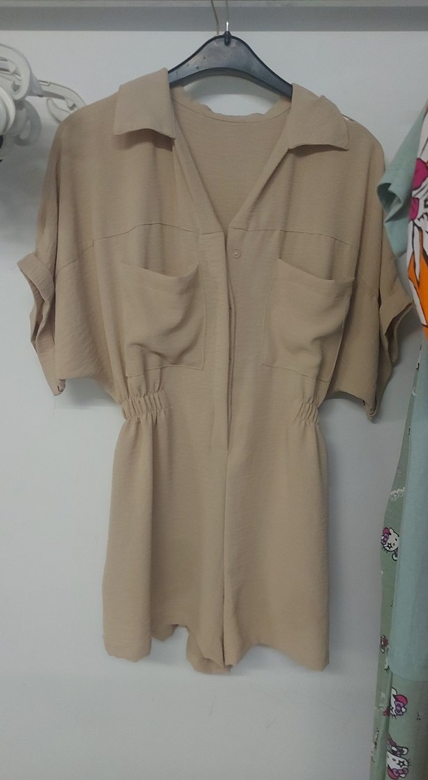 Bej renkli, önü yarıyakadar gizli düğmeli kısa kollu mini tulum. Düğmeli, bol kesim ve önünde iki cep bulunur. Yumuşak sentetik kumaştan, rahat sokak tarzı için uygun.