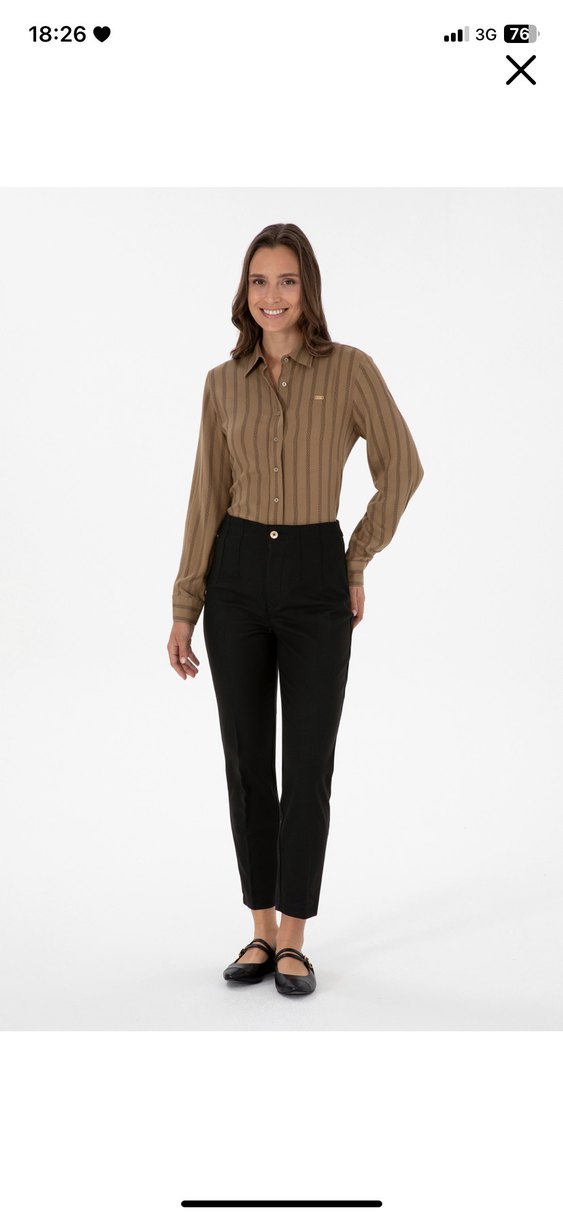 Düğmeli ön kısmı ve rahat regular fit kesimiyle bej kadın ofis pantolonu. Yumuşak sentetik kumaştan midi boyda, desen içermeyen şık tasarım.