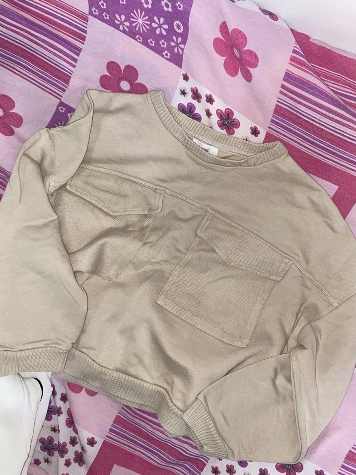 Pamuklu, uzun kollu, bej renkli, düğmeli ve ön cepli bol kesim sweatshirt. Rahat ve günlük kullanıma uygun. ✨