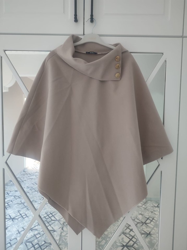 Düğmeli, yüksek yakalı bej kadın panço. Rahat kesim, kısa kollu ve midi boyda, yumuşak ve sıcak kumaştan günlük kullanıma uygun.