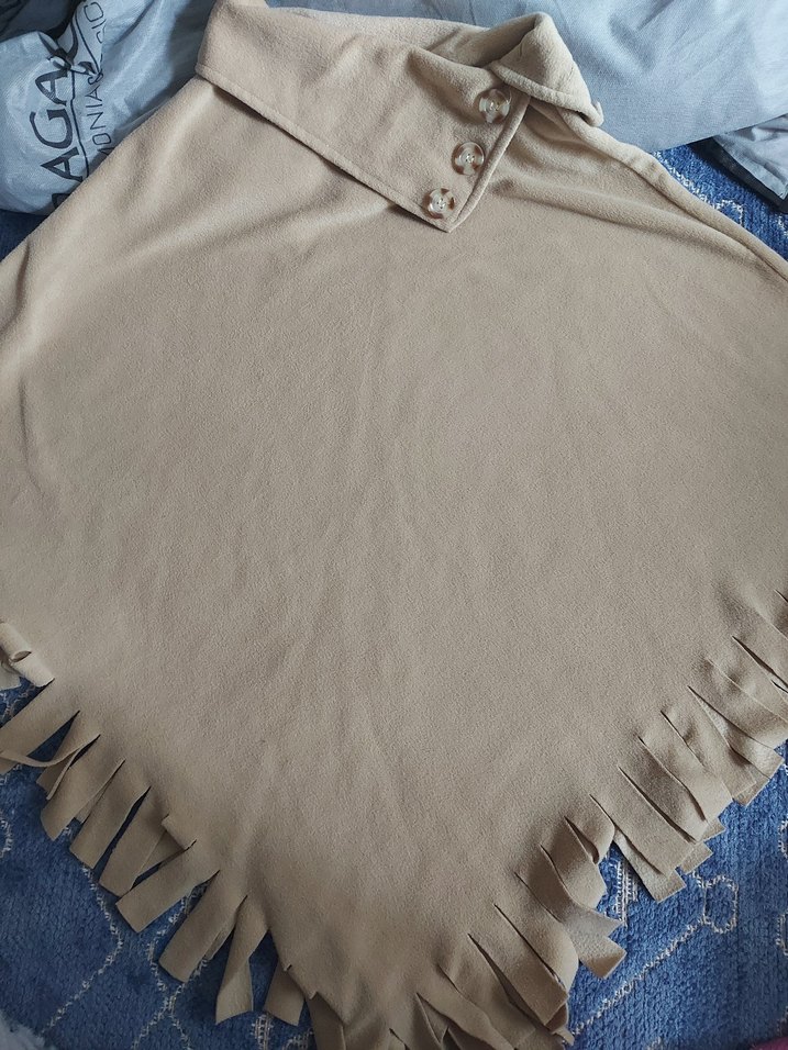 Düğmeli, uzun kollu bej kadın panço, yumuşak ve sıcak kumaştan. Yuvarlak yaka ve salaş kesim, püsküllü polar.
