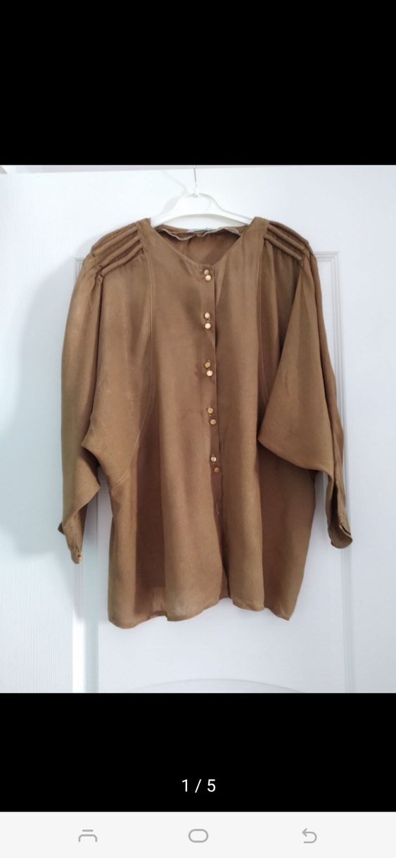 Düğmeli, bej süet kumaştan, bol kesim, uzun kollu, yuvarlak yaka kadın gömlek. Ofis için uygun parlak bir görünüme sahiptir. ✨çok sik