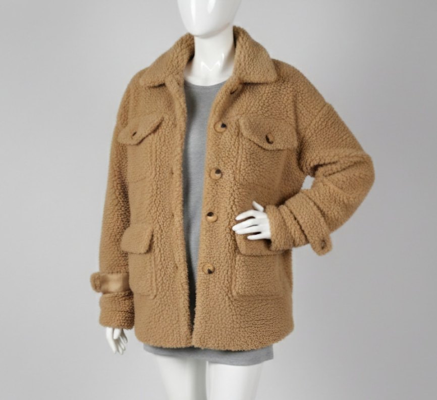 Bej renkli kadın ceketi, düğmeli ve notalı yakalı, peluş kumaştan yapılmıştır. Uzun kollu, bol kesim ve çok cepli, rahat ve şık bir görünüm sunar.