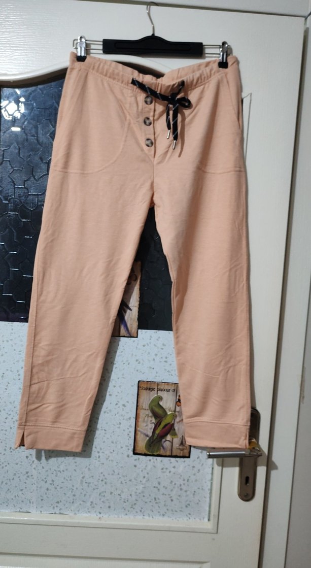 Düğmeli, bej renkli, rahat kesim kadın pantolonu. Yumuşak sentetik kumaştan, uzun boy ve desensiz, günlük kullanım için uygun. Uzunluk 90 cm ağ ölçüsü 35 cm bel ölçüsü 40 cm iyi penye kumaşa sahip