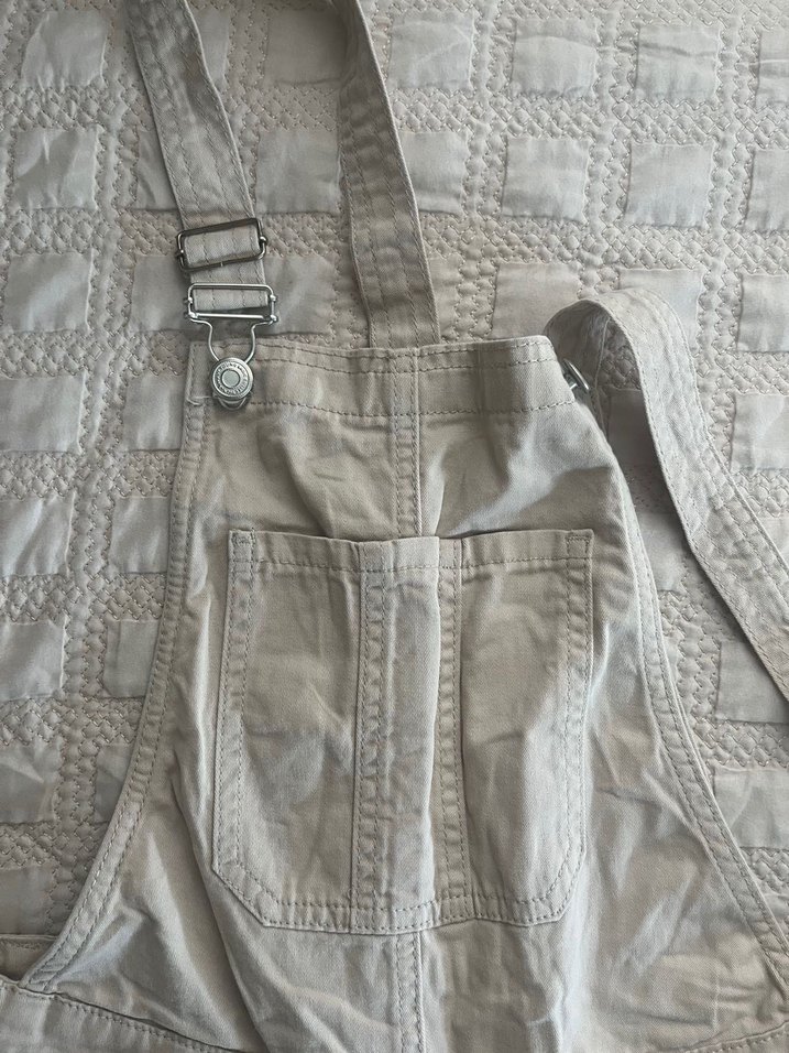 Düğmeli ve ayarlanabilir askılı, yüksek yakalı, cepli bej şort tulum. Rahat kesimiyle gündelik sokak stiline uygun.