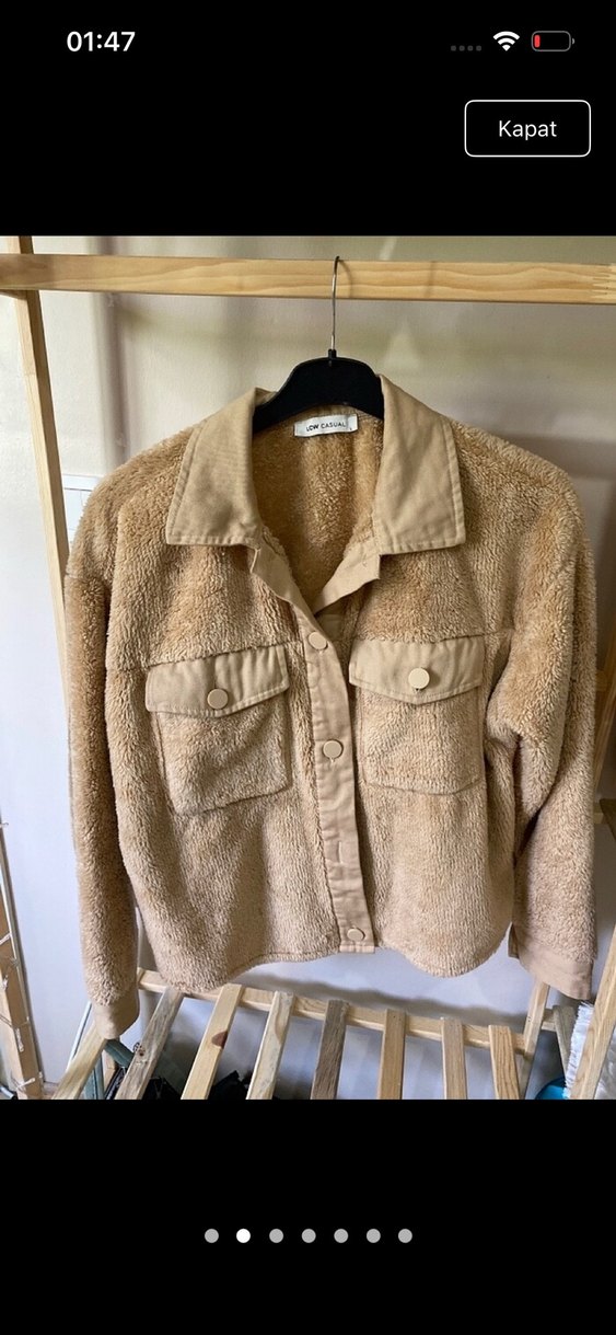 Bej süet ceket düğmeli, uzun kollu ve kesik yakalıdır. İki göğüs cebi ile rahat, kısa kesim ve salaş bir tarza sahiptir. Günlük kullanıma uygundur.