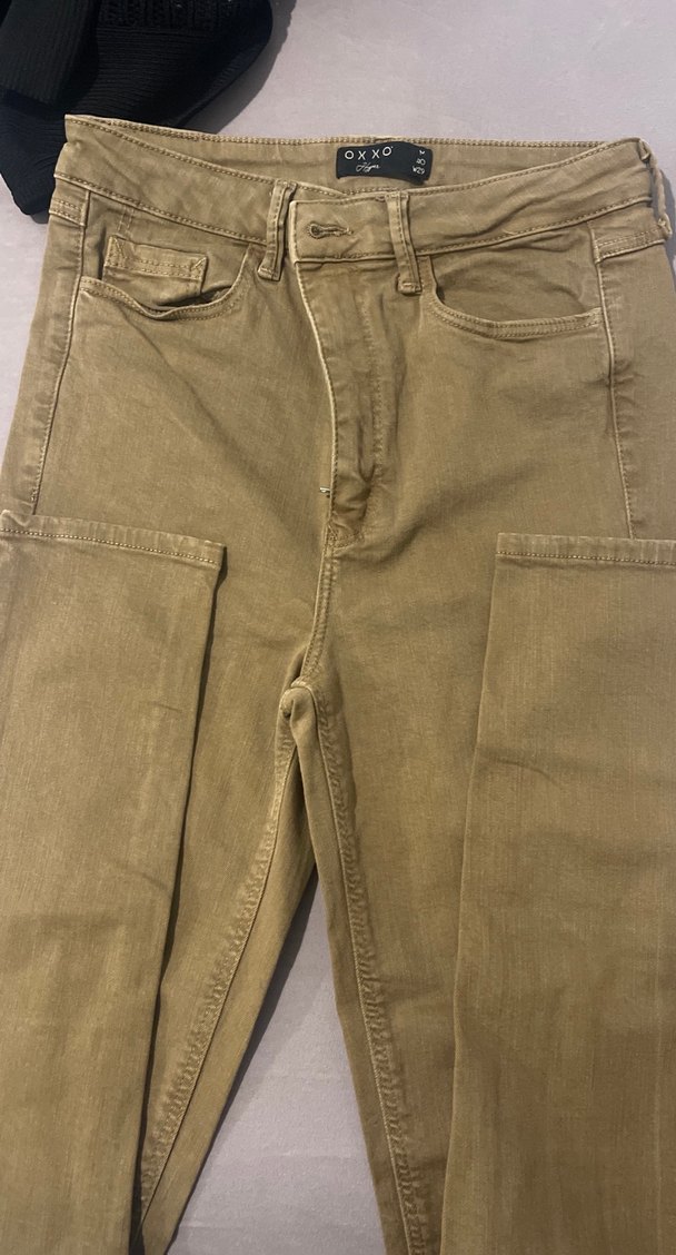 Düğmeli kapamalı, normal boy, bej renkli süet kumaştan yapılmış dar kesim pantolon. Günlük sokak tarzı için uygundur.