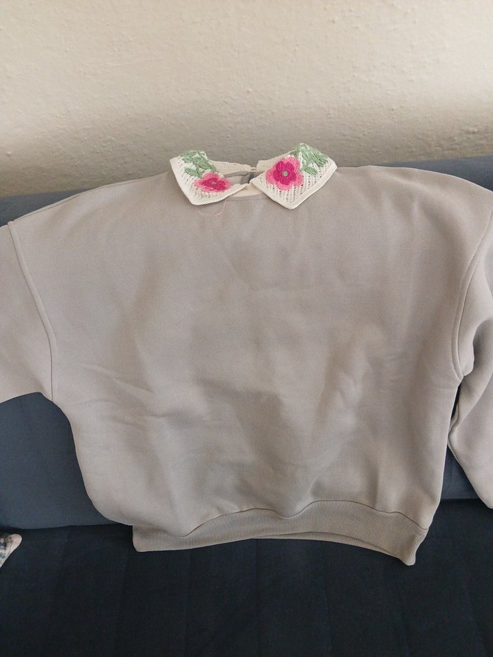 Bej renkli örme kumaştan yapılmış, çiçek nakışlı yakası ve düğmeli detayı olan uzun kollu bol kesim sweatshirt. hiç giyilmedi