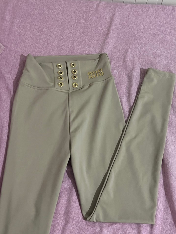 Düğmeli yüksek bel ve düz bej renkli, sentetik kumaştan yapılmış, günlük sokak stili için uygun dar kesim tayt. ️