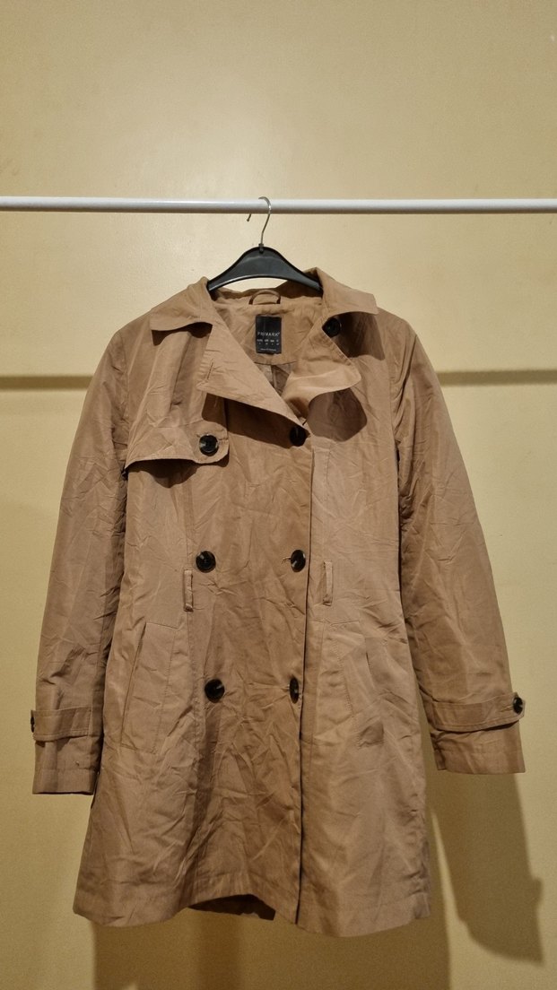 Bej renkli kadın trençkot, düğmeli ve kesik yaka detaylıdır. Uzun kollu, midi boy ve düzenli kesimdir. Sentetik kumaştan yapılmıştır, günlük sokak stili için uygundur.