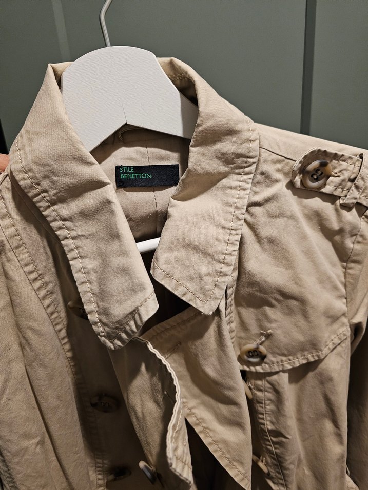 Bej renkli, Benetton marka,klasik model,keten kumaştan kadın trençkot. Düğmeli ve kesik yakalı, small beden ve regular fit, sokak stili için uygun uzun kollu model.