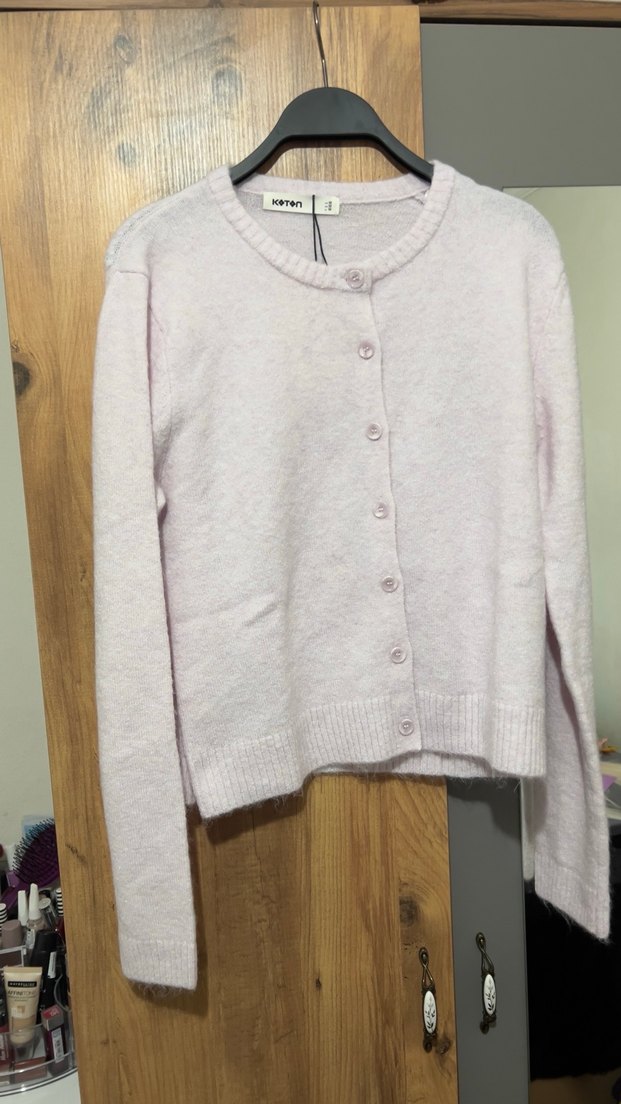 Bej renkli triko hırka, uzun kollu, yuvarlak yaka ve bol kesimdir. Düğmeli ön kısmı ve normal midi boyuyla günlük kullanıma uygundur.