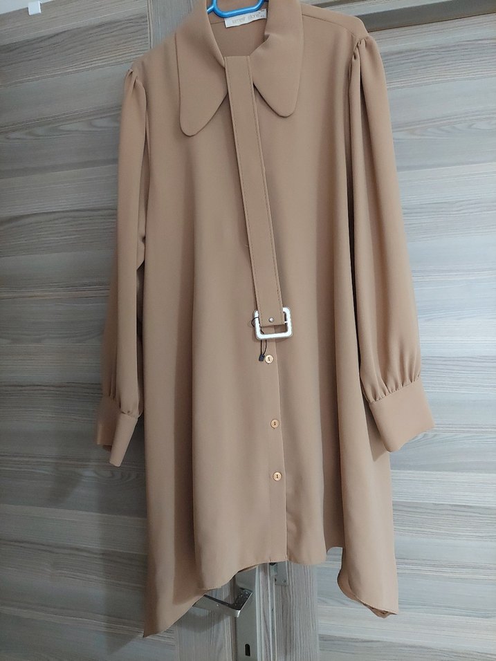 Bej renkte, uzun kollu ve düğmeli kadın tunik. Salaş kesim ve geniş yakalı, düz dokulu sentetik kumaştan üretilmiştir. Ofis için uygundur. hiç kullanılmadı sıfır tunik takim marka temsili