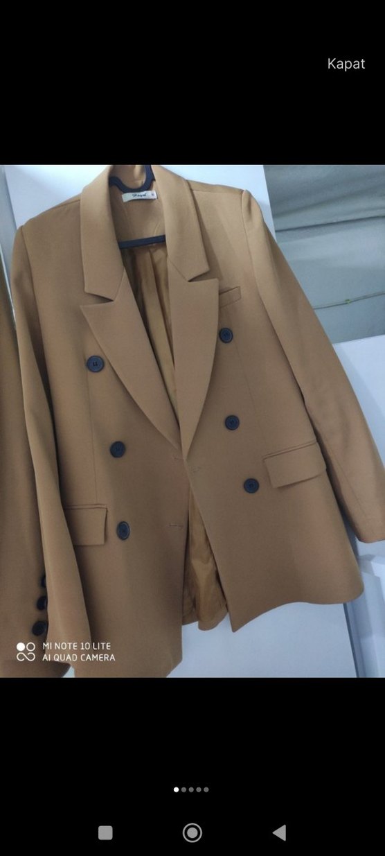 Düğmeli ön kısmı ve kesik yakasıyla bej uzun kadın blazer ceket. Sentetik kumaştan, uzun kollu ve rahat kesim, ofis için uygun.