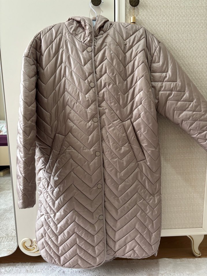 Düğmeli kapamalı, bej renkte uzun kadın ceket. Yumuşak sentetik kumaştan üretilmiş, rahat kesimli ve gündelik kullanıma uygun.