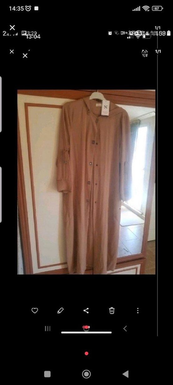 Bej renkli, düğmeli uzun elbise, bol kesim ve uzun kolludur. Notlu yaka ve ipeksi kumaşla sade sokak stili için uygundur.