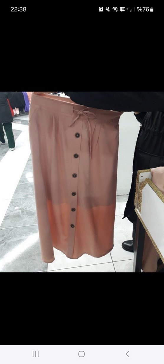 Bej renkli, düğmeli ve bol kesim uzun etek, yumuşak ve ipeksi dokusuyla günlük sokak stiline uygundur.