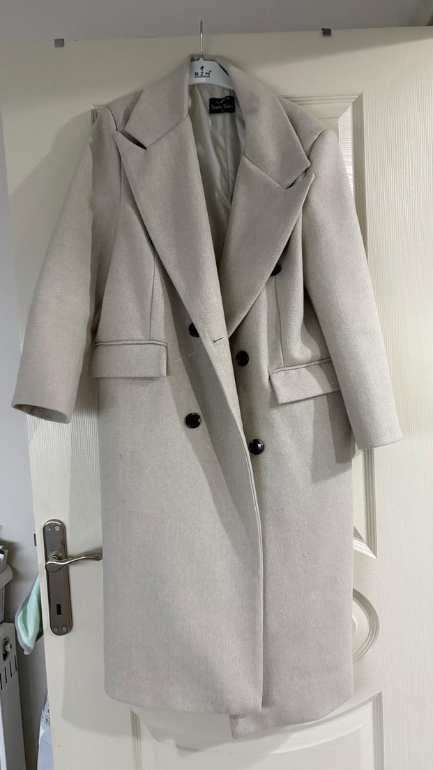 Bej renkli, uzun kesim kadın kaban. Düğmeli ve keskin yakalı, klasik ve ofis stiline uygun, regular fit ve uzun kollu.