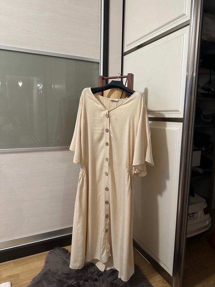 Bej renkli bu uzun elbise, keten kumaştan üretilmiş, düğmeli ve kısa kolludur. Bol kesimi ve kayık yaka detayıyla minimalist ve desensiz tasarıma sahiptir.