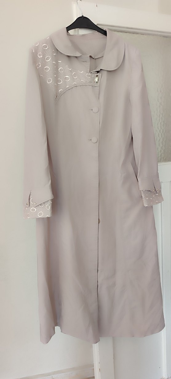 Düğmeli, bej renkte uzun kadın kaban. Notlu yaka, uzun kollu ve klasik vintage tarzda, ofis için uygun, ipeksi dokulu ve düz desensiz.
