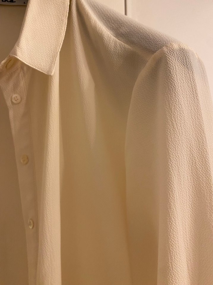 Bej renkli, düğmeli ve yakalı kadın gömleği. İpek gibi kumaştan, kısa kollu ve normal kesim, minimalist ofis tarzı için uygun.