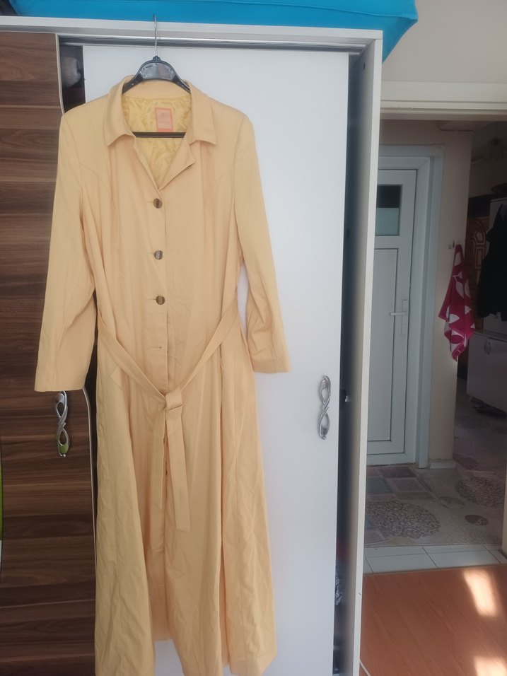 Bej renkli, keten kumaştan uzun kadın trençkotu. Düğmeli, kuşaklı ve çentikli yakalıdır. Uzun kollu, vintage tarzıyla günlük kullanıma uygundur.