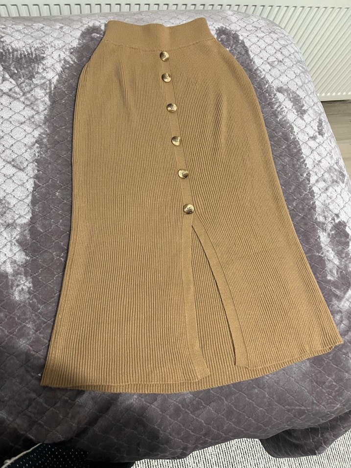 Bej renkli, düğmeli ve vücuda oturan uzun yırtmaçlı triko etek, günlük kullanıma uygun rahat ve sade bir tarz sunar.