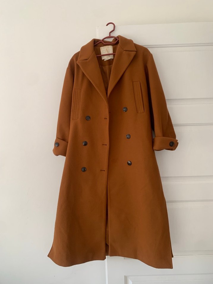 Bej renkte, yün kumaştan yapılmış kadın uzun kaban. Düğmeli ve çentikli yaka detaylı, uzun kollu, günlük kullanıma uygun normcore tarzda.