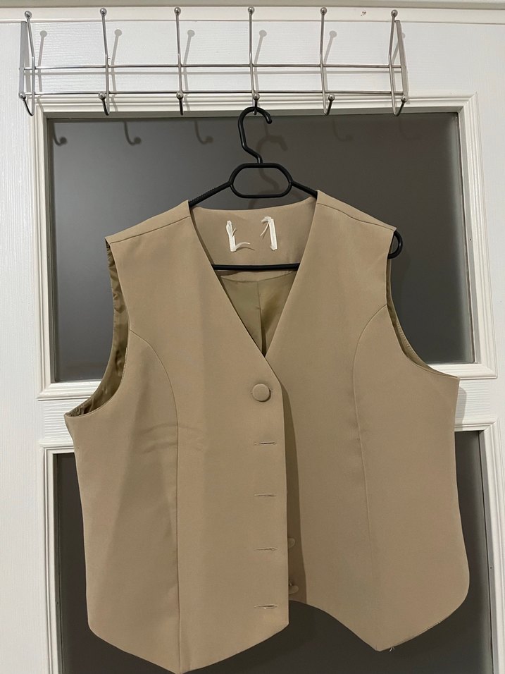 Bej renkli, düğmeli ve kolsuz yelek. Notched lapel yakalı, midi boyda ve rahat kesimli. Ofis için uygun, sentetik dokulu kumaştan yapılmıştır.