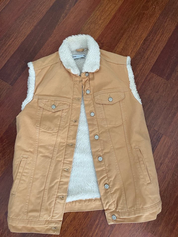 Düğmeli, bej renkli, yumuşak iç astarlı, normal boy ve regular fit kadın yelek.