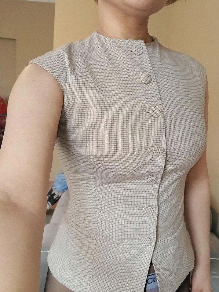 Düğmeli, kolsuz bej yelek, normal kesim ve midi boy. Notlu yaka detayıyla, yumuşak sentetik kumaştan, ofis ve günlük kullanıma uygun.