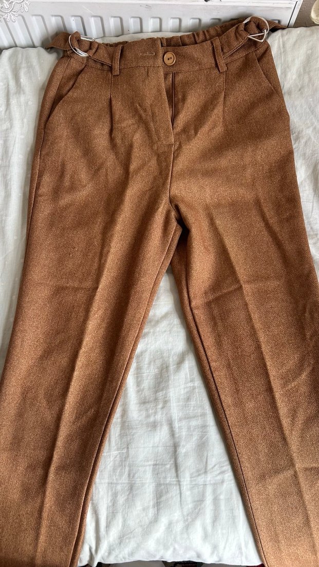 Düğmeli, düz bej yün kumaş pantolon. Kadınlar için normal kesim ve midi boyda, ofis kullanımı için uygun, rahat ve sade tarzda. ✨