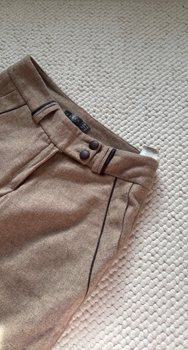 Düğmeli, bej renkli yün kumaştan yapılmış, rahat kesime sahip kadın pantolon. Midi boyda, desen içermeyen ve günlük kullanıma uygun.
