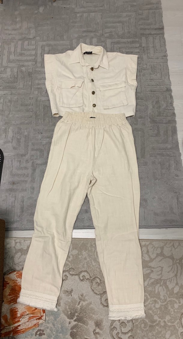 Düğmeli ön ve yaka detaylı, keten kumaştan bej , salaş kesim, kolsuz . Hiçbir sorunu yoktur