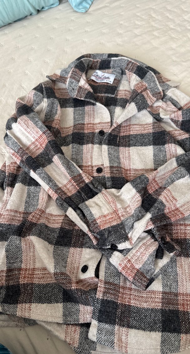 Yumuşak pamuklu, bej renkli kareli desenli, uzun kollu, düğmeli ve notched lapel yakalı bol kesim cocuk gömlek. Rahat ve günlük stil için uygundur.