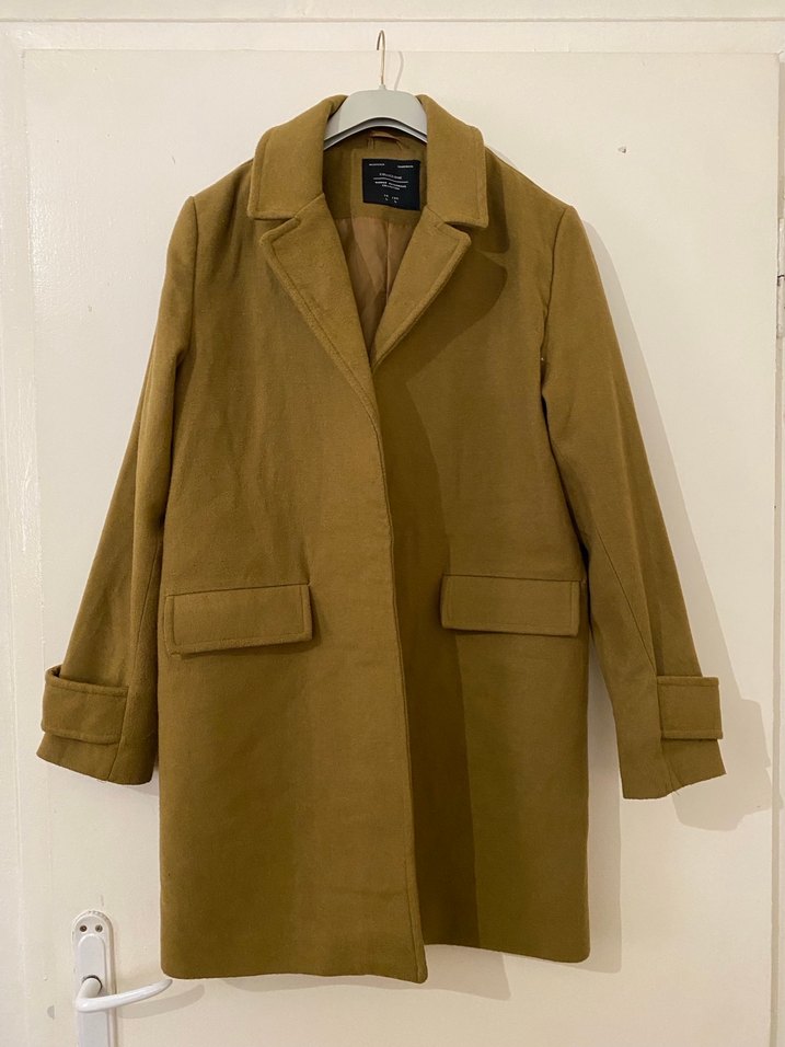 Bej renkli kaşe,düğmeli ve normal boy midi kadın kabanı. Notlu yaka ve uzun kolludur, ofis için uygundur. ✨