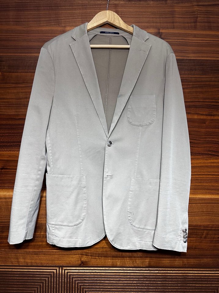 Düğmeli, bej renkte keten kumaştan yapılmış, klasik kesim erkek ceket. Notlu yaka ve uzun kolludur, iş ortamı için uygundur.