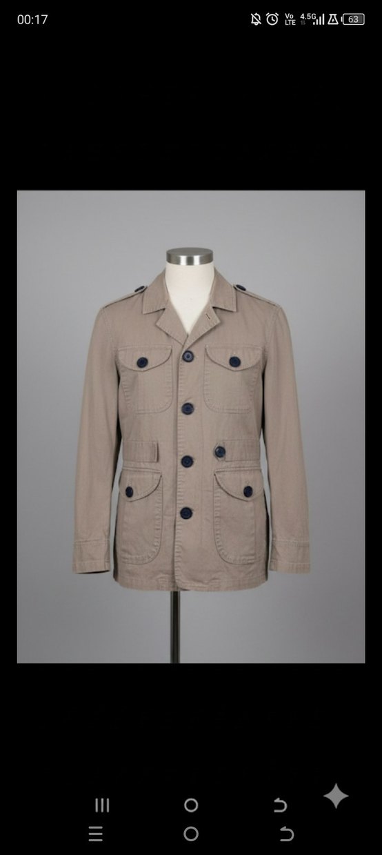 Bej keten erkek ceket, düğmeli önü ve kesik yaka ile. Uzun kollu, normal kesim ve midi boy, rahat sokak stili için uygun. Çoklu cepler ve düğme detayları bulunur.