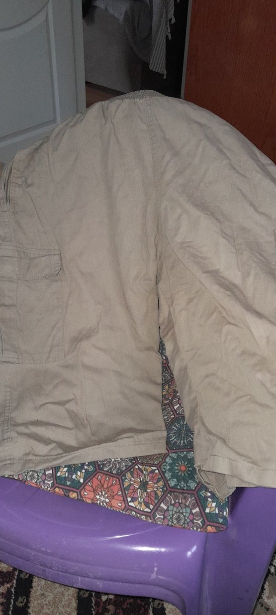 Düğmeli detaylara sahip, rahat kesim bej keten pantolon, midi boyda, günlük kullanıma uygundur.