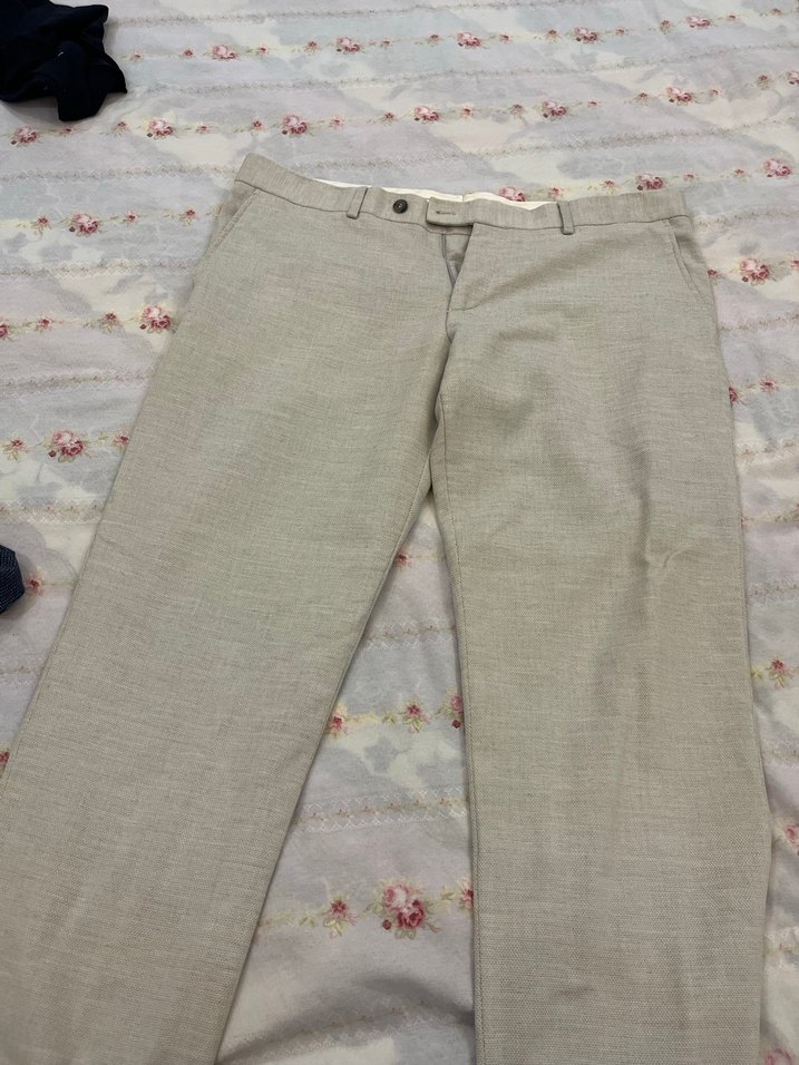 Düğmeli, bej keten erkek pantolon, rahat kesim ve normal boyda. Günlük ve ofis kullanımı için uygundur. Trendy normcore tarzı sunar.