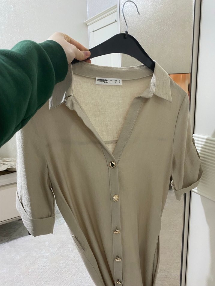 Bej keten gömlek elbise, düğmeli ve yakalıdır. Uzun kollu, bol kesim ve midi boyda, günlük kullanım için uygundur. Desensiz sade tasarım.