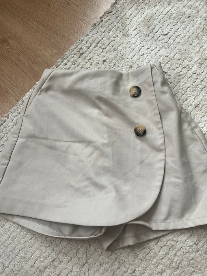 Bej renkli keten kumaştan, düğmeli ve bol kesim hamile mini etek. Sade ve bohem tarzıyla günlük kullanıma uygundur.