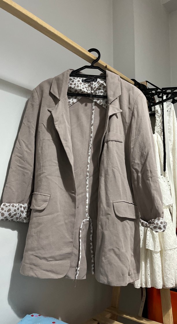 Bej keten kumaştan, düğmeli ve kesimli yakalı kadın blazer. Uzun kollu, desenli iç manşetlerle günlük sokak tarzına uygun, rahat kesim.