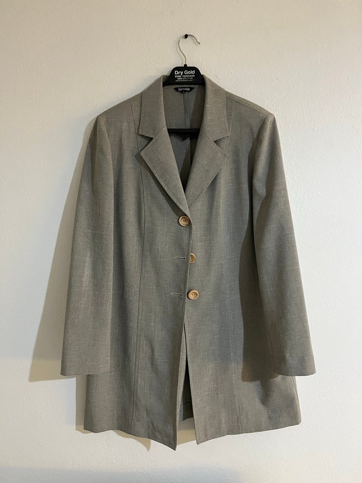 Bej keten kumaştan yapılmış, düğmeli ve yaka detaylı kadın blazer. Uzun kollu, normal uzunlukta ve klasik şıklıkta, ofis için uygun.arka kısmında nokta gibi leke mevcut belirtildi